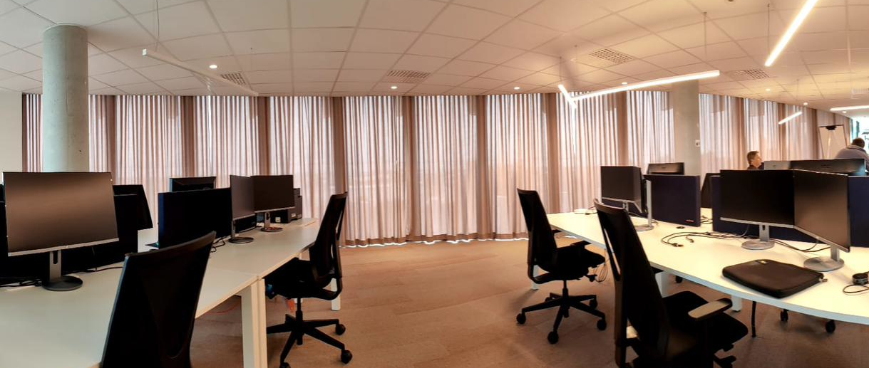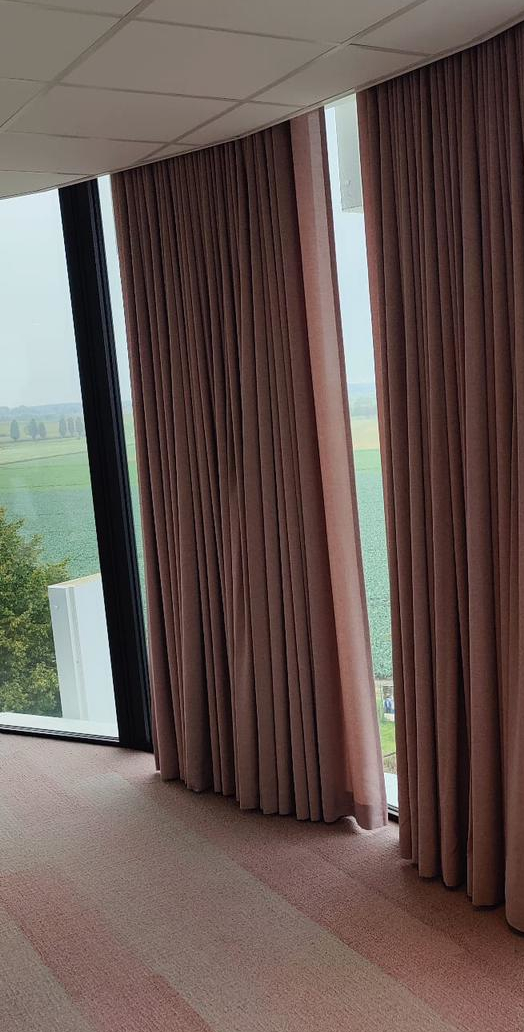Special design with windows in arc shape. where the curtain profiles follow the arc shape. The curtains can be freely positioned where necessary according to the position of the sun. A pleasant indoor climate with sun protection and acoustic comfort are the result.